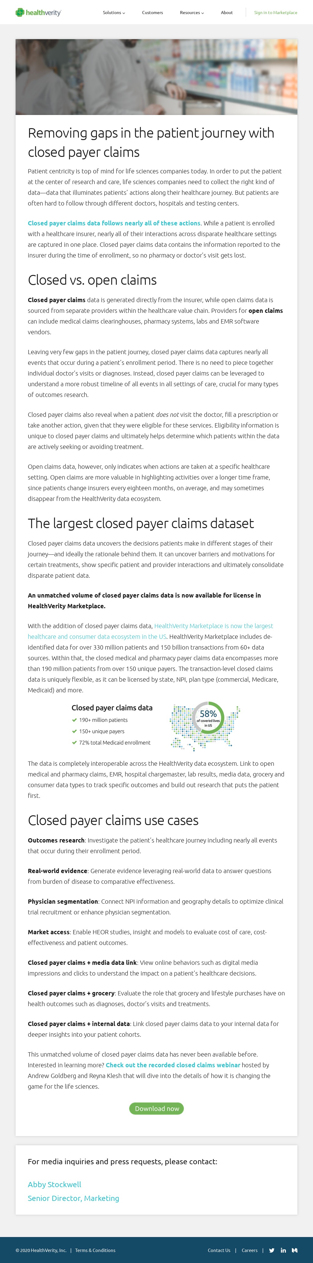Blog: Removing gaps in the patient journey with closed payer claims Posted byHannah BurksMarch 29, 2020March 29, 2020Posted inBlog https://blog.healthverity.com/removing-gaps-in-the-patient-journey-with-closed-payer-claims